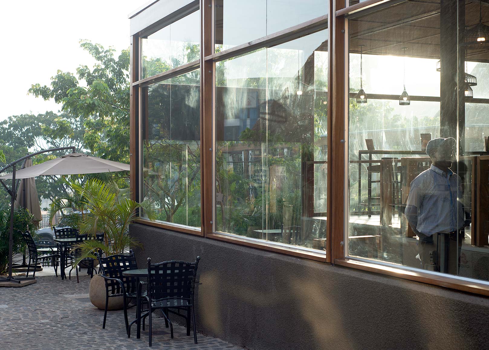 The new delicatessen market accommodates most of the climate sensitive food stuffs and services in the centre and the back of the building. Overlooking the central piazza, however, is a raised portion of the building that houses the eatery and juice bar with its seating area. Customers have views towards the other buildings in the mall, as well as the entry way water feature, as they enjoy the refreshments on offer.