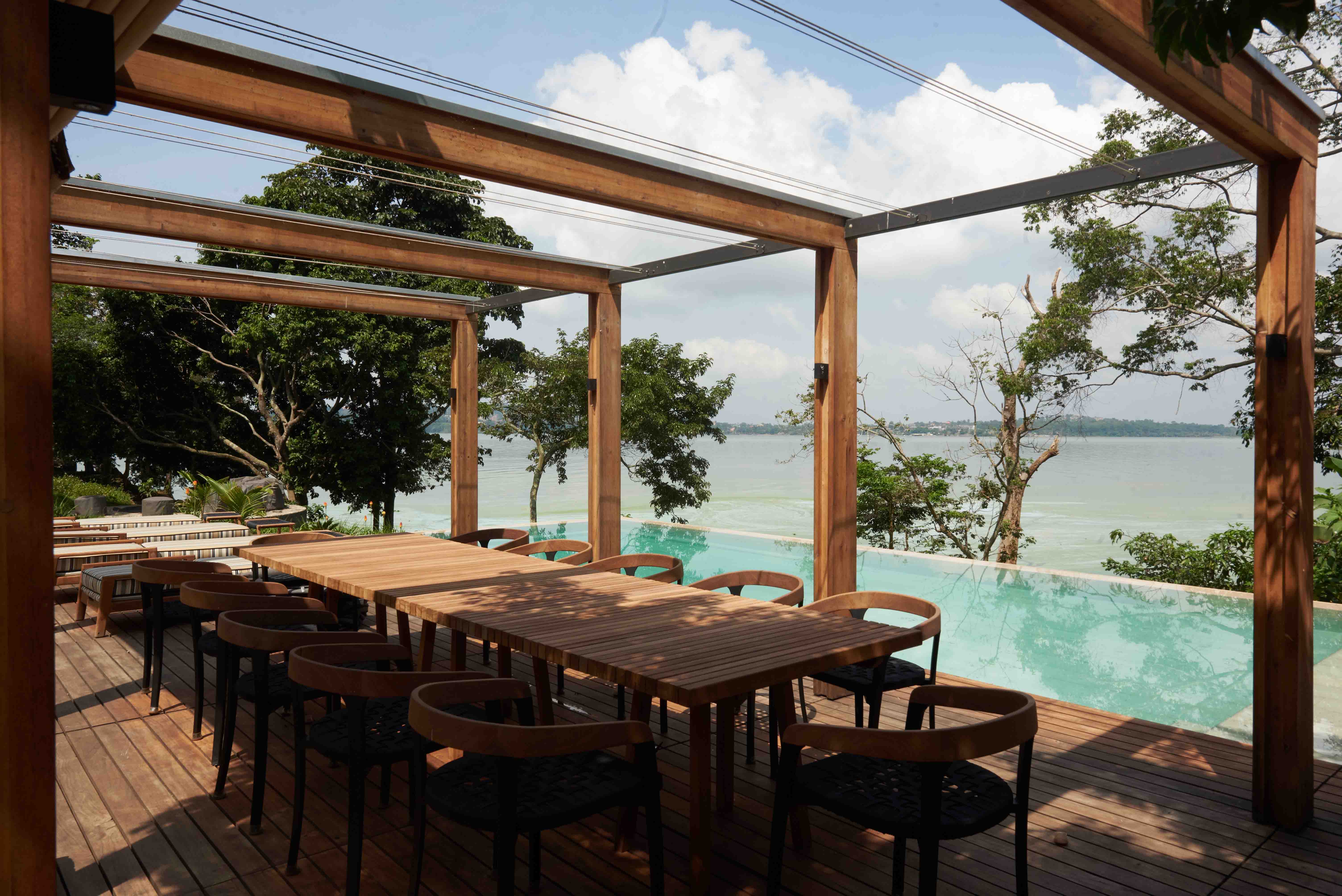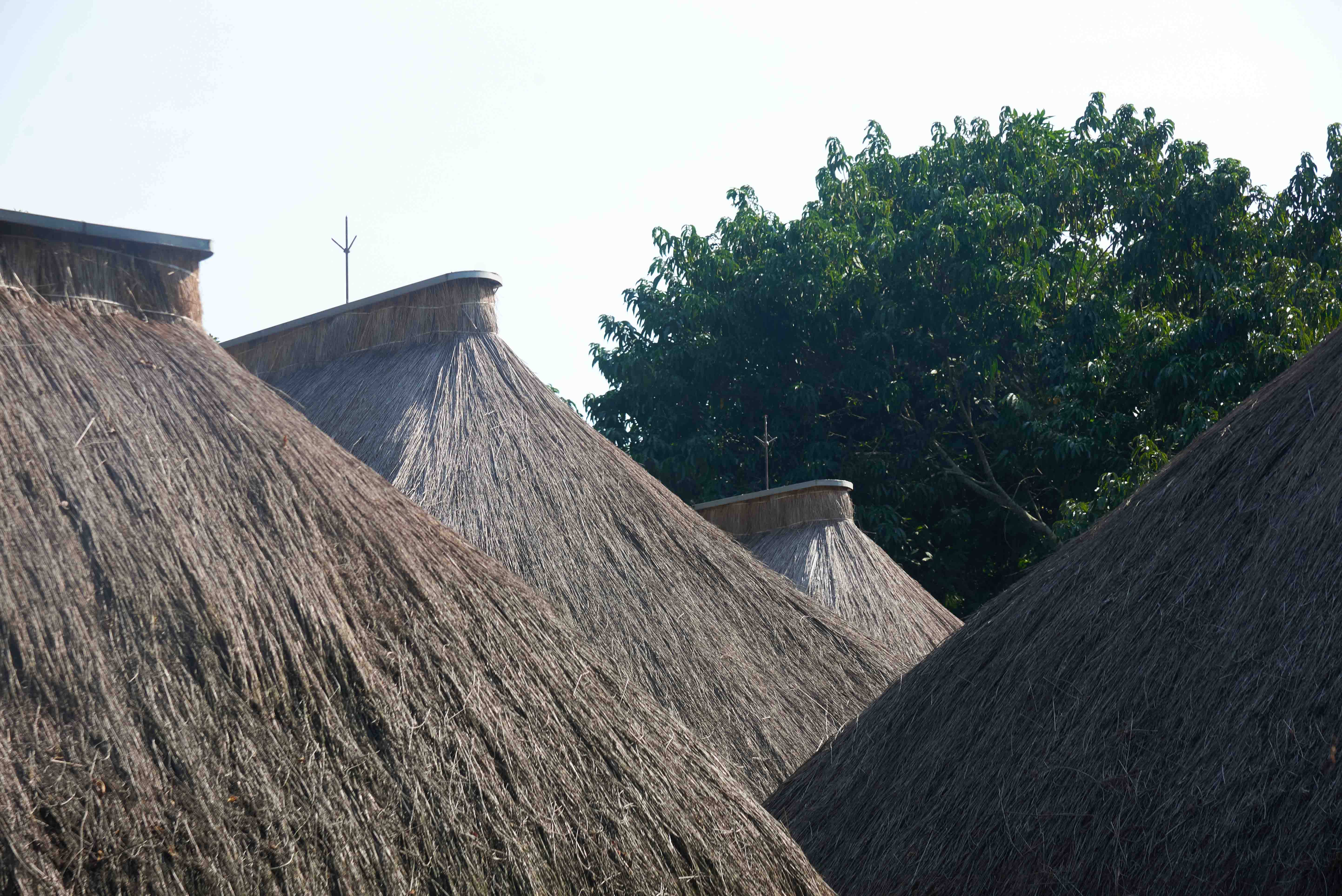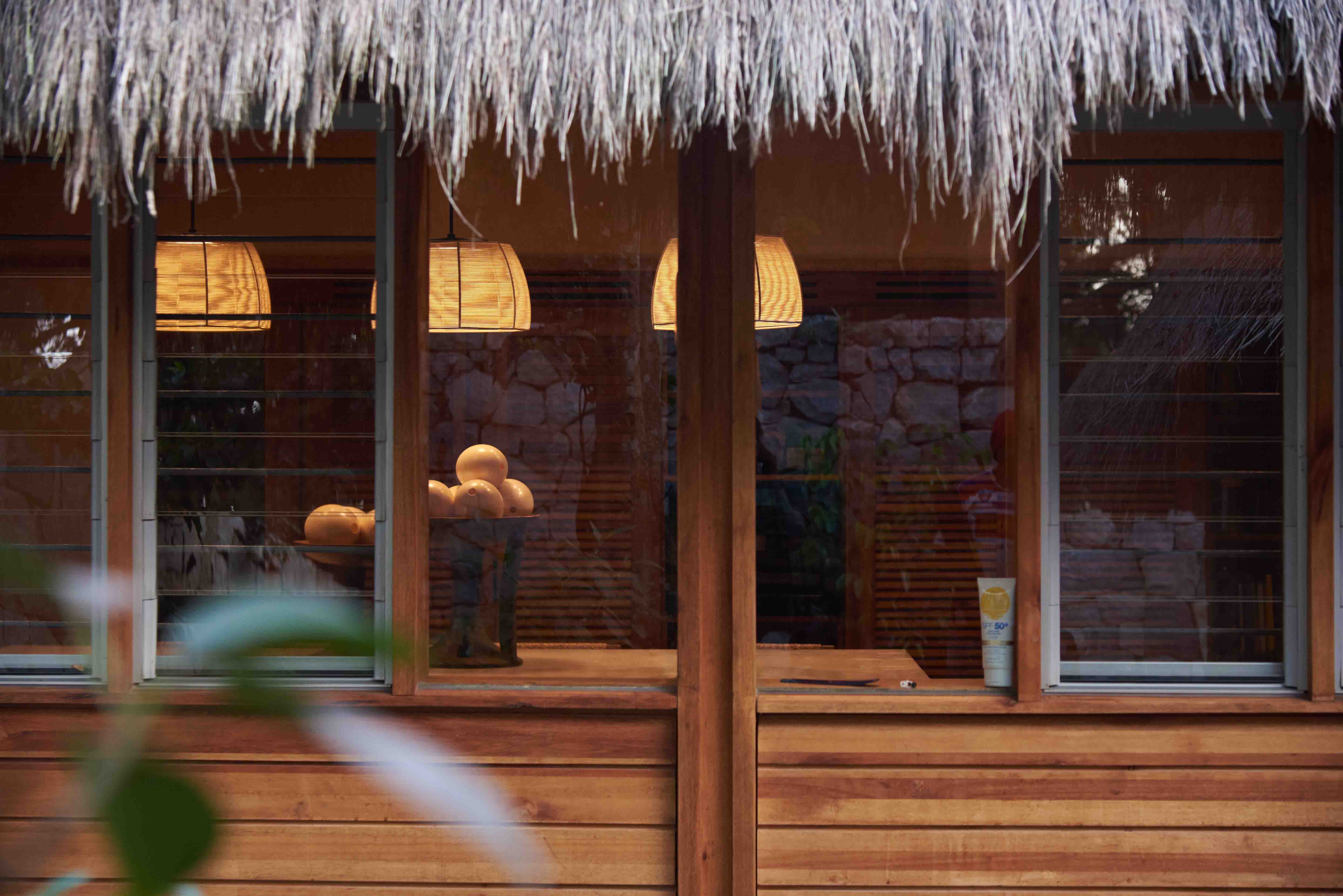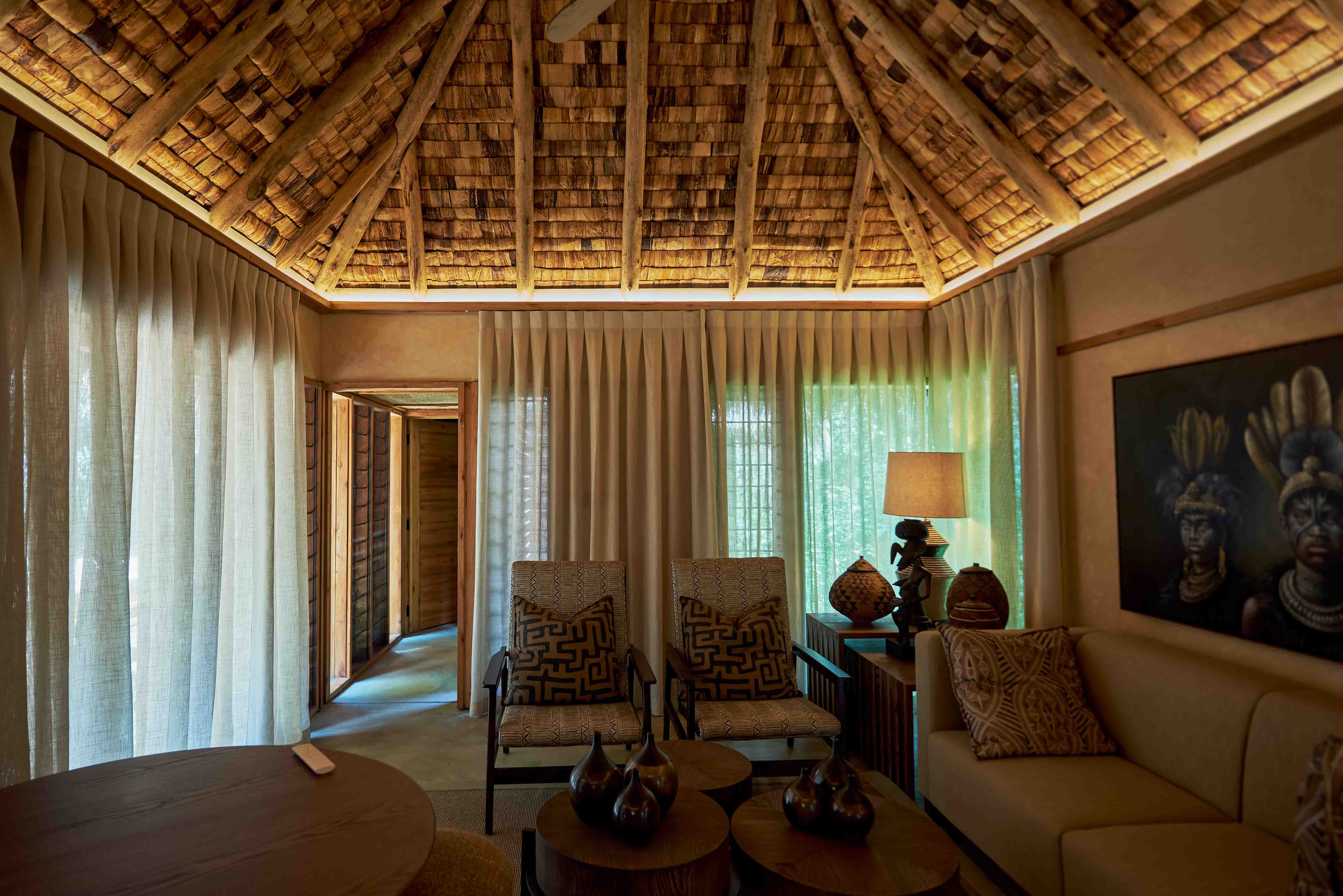Seen from the lake, the buildings transform their character entirely. Here, grass-thatched roofs with deliberately imperfect edges blur the boundary between architecture and nature, whilst generous glazing and timber louvres invoke the relaxed confidence of coastal living. The materiality speaks the vernacular language of tropical retreat – stone foundations anchoring the buildings to the earth, timber frames breathing with the humid climate, and natural grass roofs ageing gracefully under Africa's intense sun.