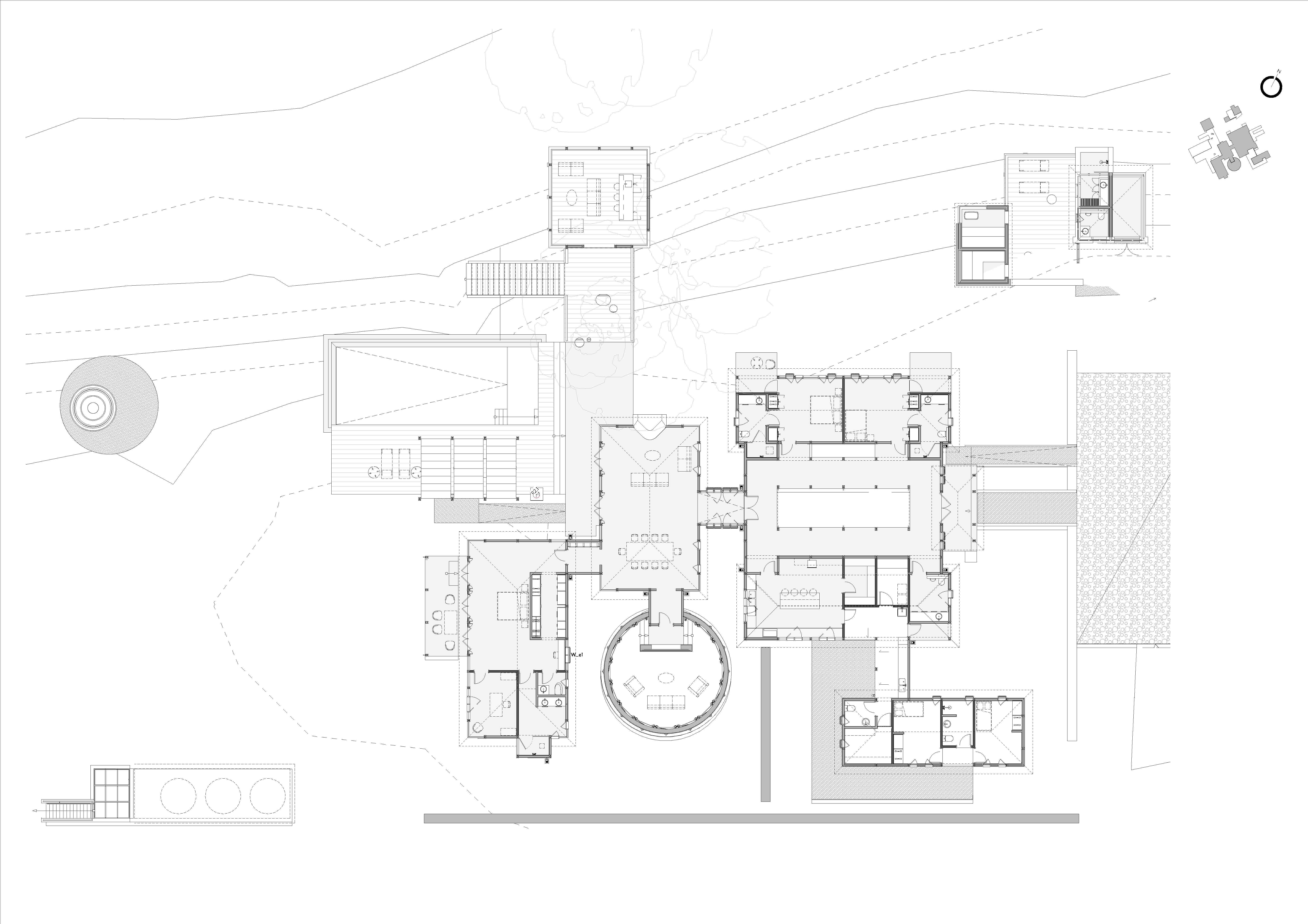 The Main Cottage abandons conventional domesticity for something far more intriguing – a residential village that borrows its organisational logic from the ancient Dogon homesteads of Mali. Here, each room claims its own building, connected by meandering walkways that weave between preserved trees like gentle tributaries. This radical fragmentation allows the architecture to embrace rather than erase the forest's existing inhabitants, turning what could have been a single monolithic structure into a collection of intimate pavilions that breathe with the landscape.