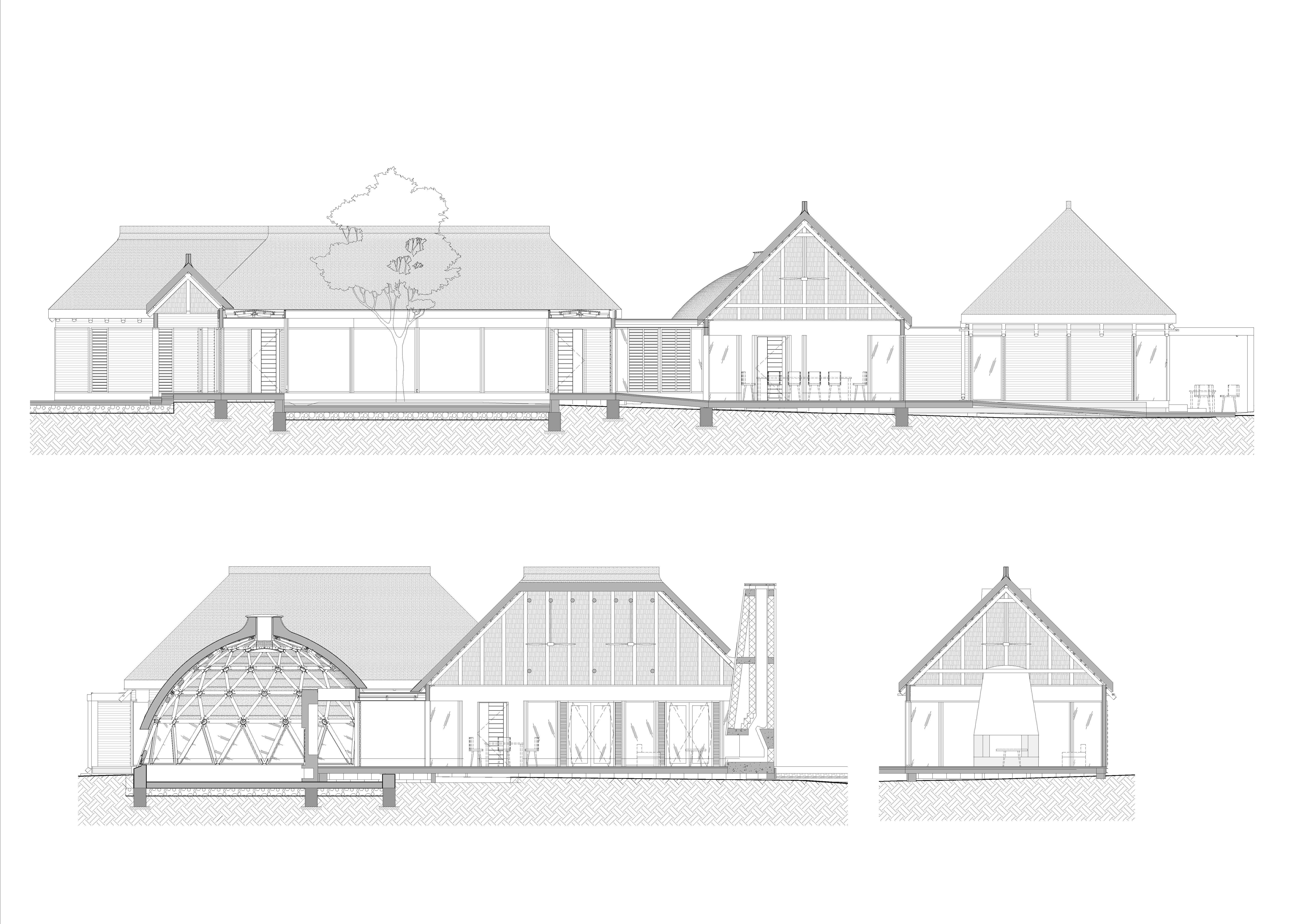 Sustainability is not a layer applied later, but the project's structural logic. Regenerative materials such as timber, grass and banana fibre are used throughout, natural ventilation replaces mechanical systems, tree conservation guides the layout, and building forms respond to sun, breeze, and rainfall. All design decisions –from water and energy systems to construction phasing – have been coordinated across disciplines from the start, allowing the proposal to align with both environmental ethics and the family's vision of responsible leisure.