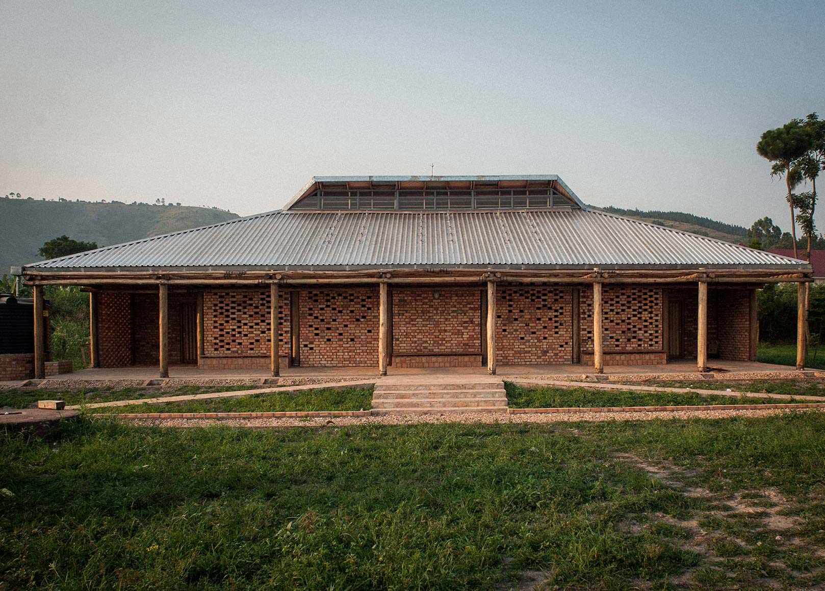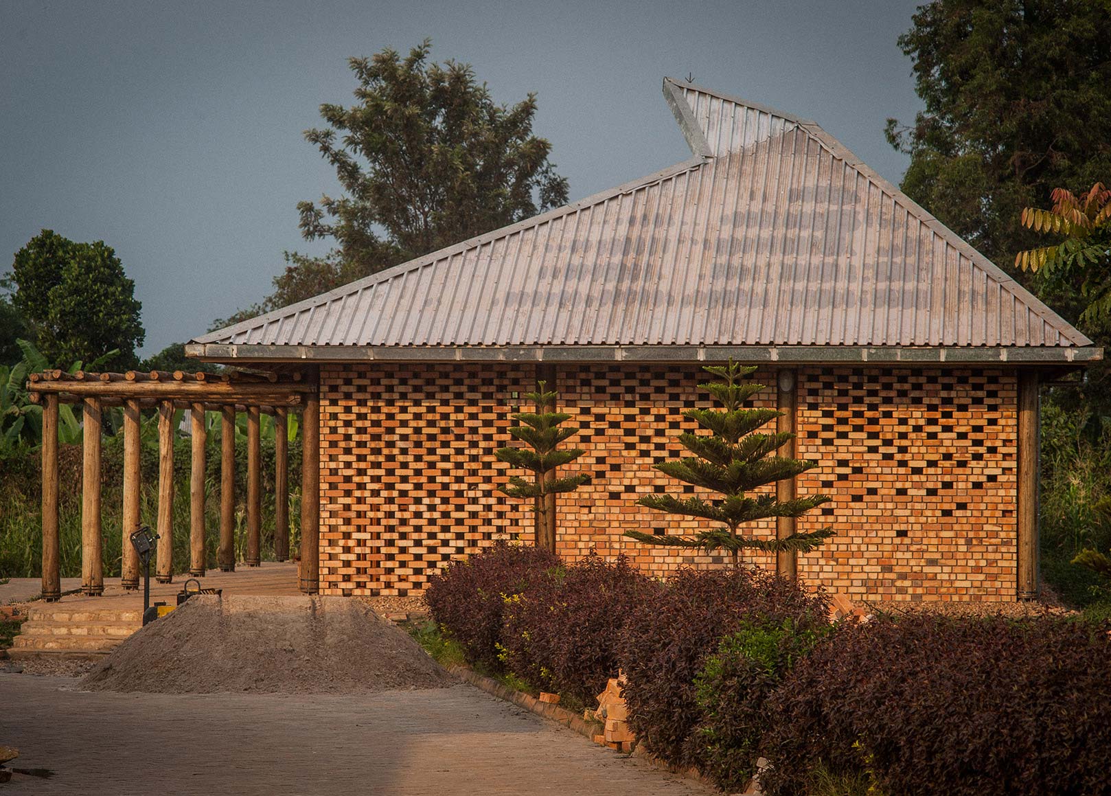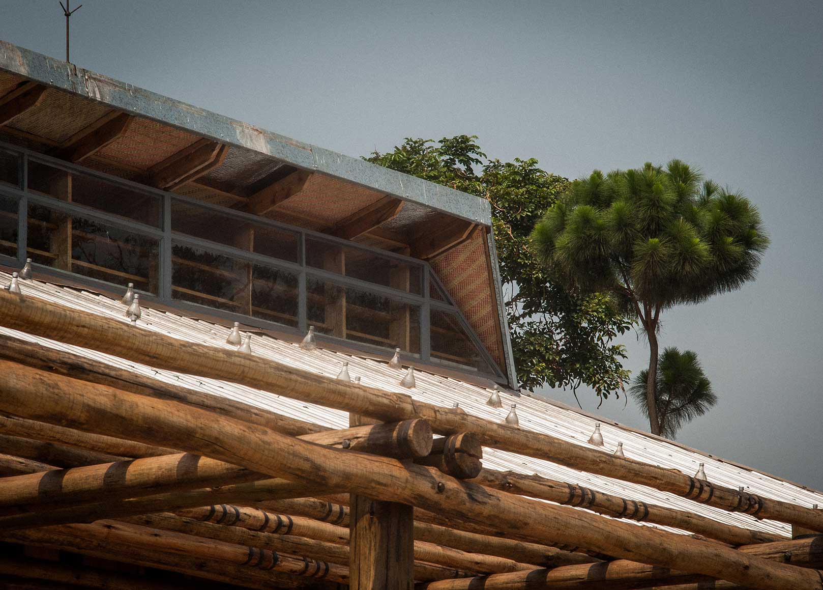The main structural material are Eucalyptus poles which are interconnected by exposed claybrick walls. The roof is clad with reflective zinc-al roofsheets and the open ceiling is made of purpose-made 'mukeka' reed mats.
