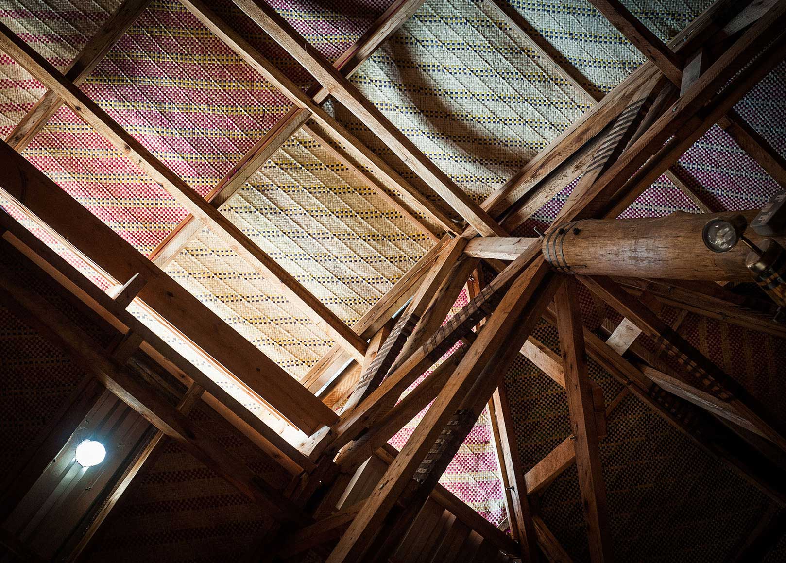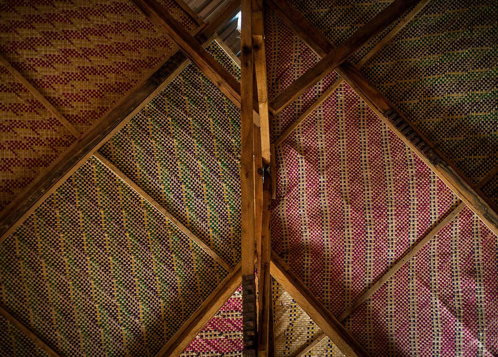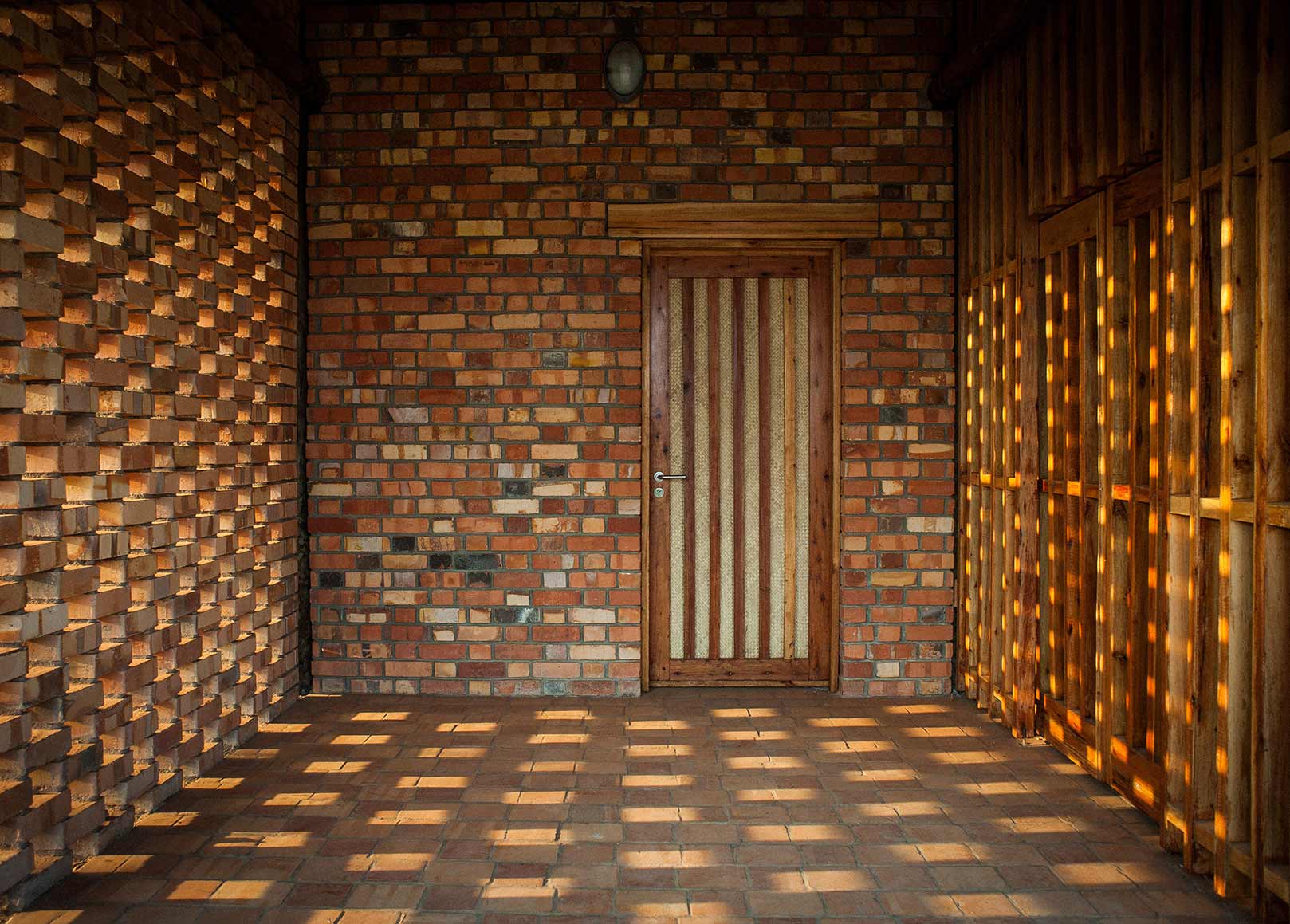 The main structural material are Eucalyptus poles which are interconnected by exposed claybrick walls. The roof is clad with reflective zinc-al roofsheets and the open ceiling is made of purpose-made 'mukeka' reed mats.