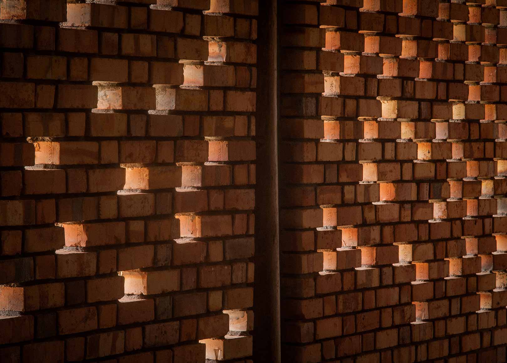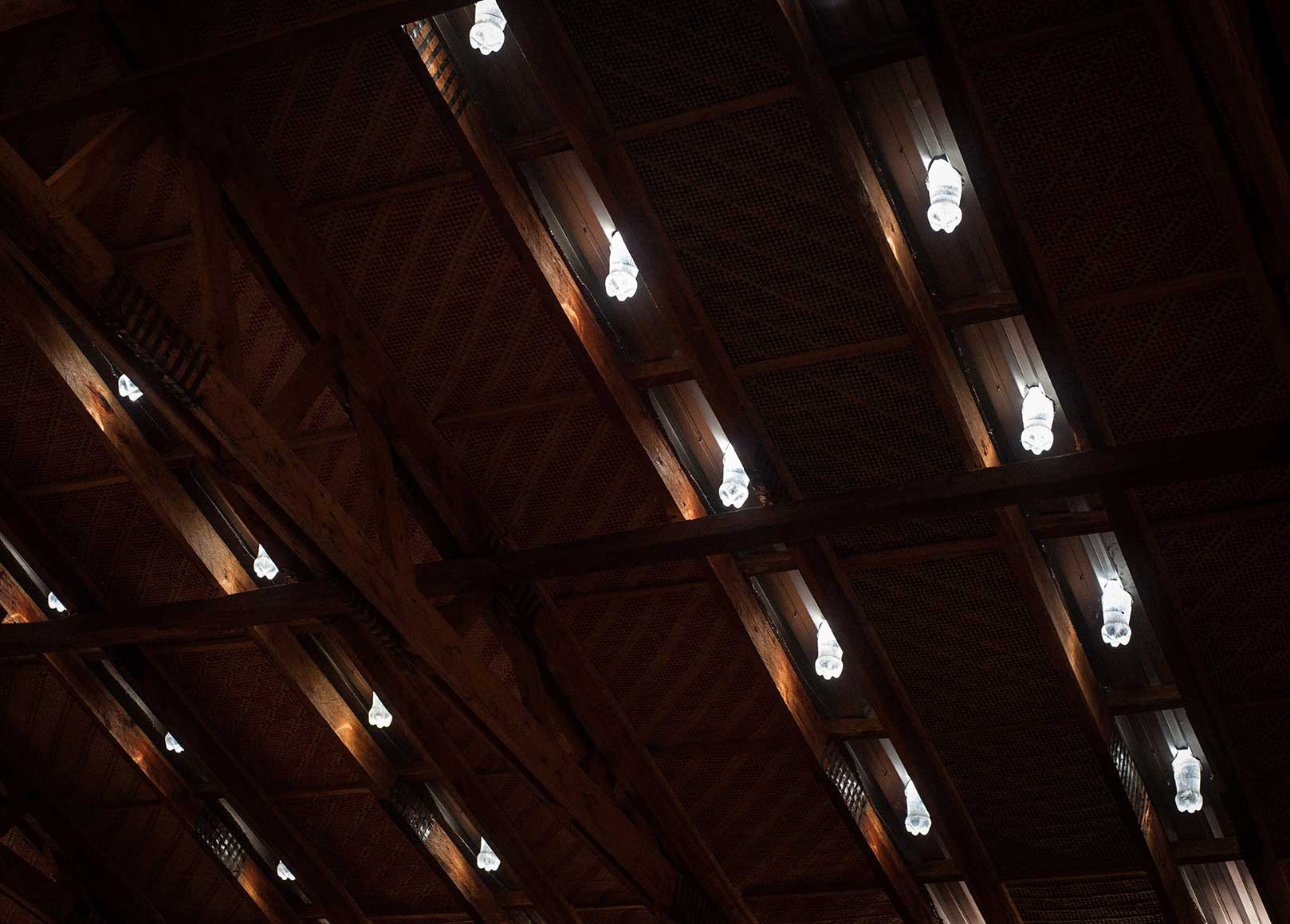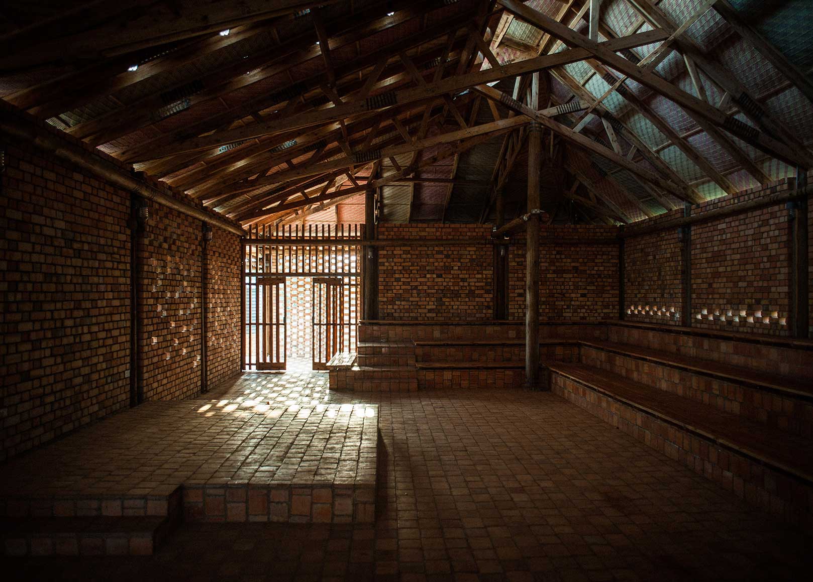 It is a small community centre for 150 people, with raked seating and a small speaker's platform. There is also a private meeting room and a store. The main assembly hall has no windows with all daylight provided by a roof light, intricately perforated brick screens and the so-called 'Litres of Light', plastic bottles penetrating the roof and filled with water and bleach, thereby acting as 'light bulbs' during the day.